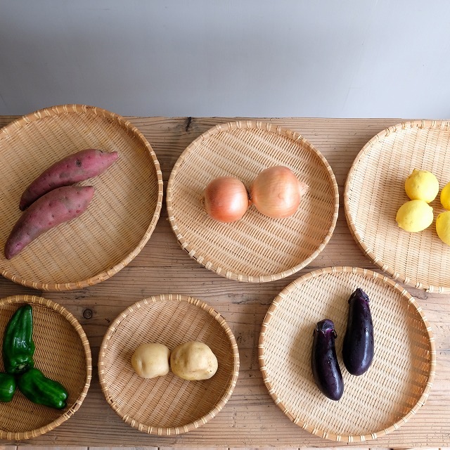 竹製の丸ざるが6個セットです。積み重ねてもすっきりで、色々な干し物が楽しめますね。