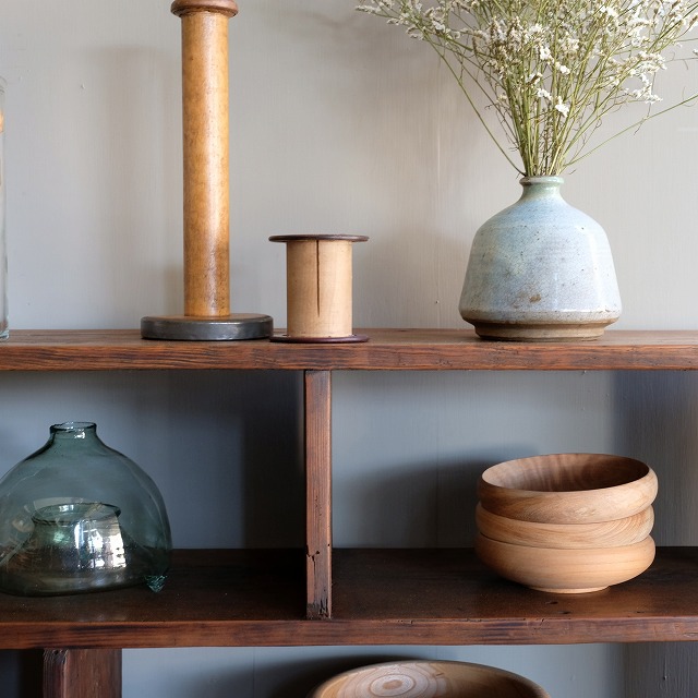 5マスの木製格子棚です。ずっしりとして重厚です。マス目の棚は、1マス1マスが、額縁のように雑貨を引き立ててくれます。オープン棚なので、表裏どちらからでもいいので、間仕切りとしてもいいと思います。