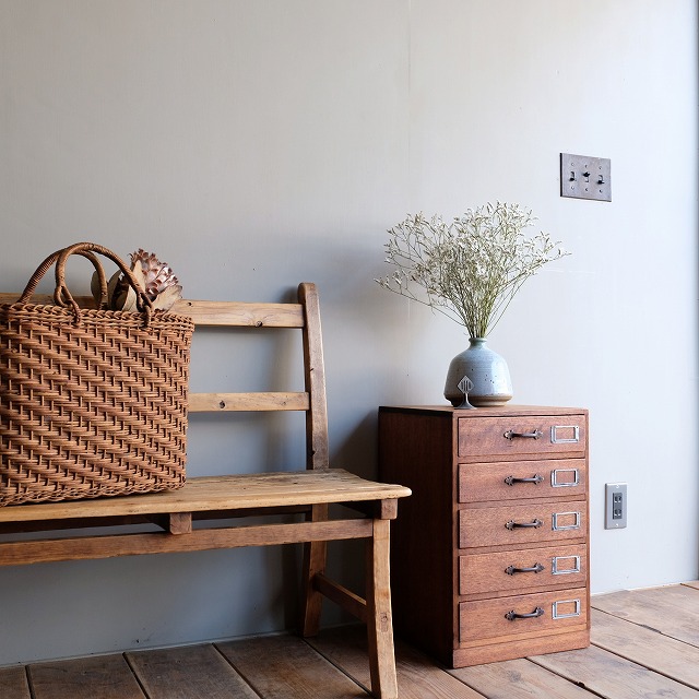 大きなネームプレートが印象的な引き出しです。明るすぎず暗すぎない木色は、色々なお部屋に合わせやすいですね。