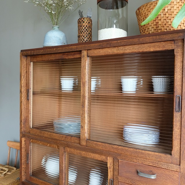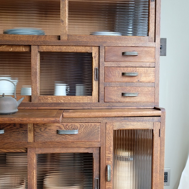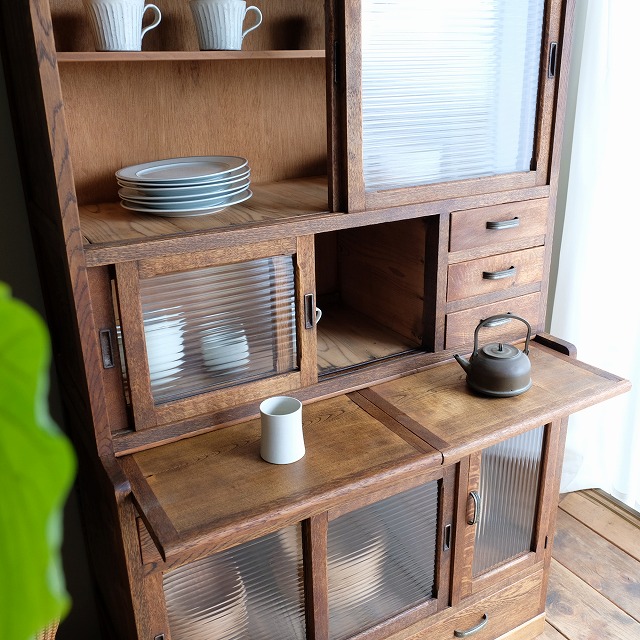 重ね式、木製食器棚です。ガラス全部にモールガラスが使用されています。とても贅沢ですね。出し入れできるテーブル付きで、ちょっとした作業にあると大変便利です。「引き戸」「開き戸」「引き出し」「出し入れできる作業台」と様々な機能が揃ったところが、とても機能的ですね。