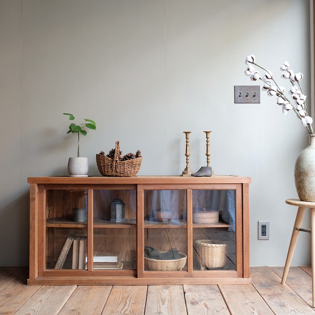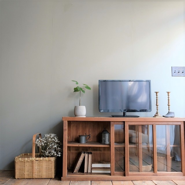 横長タイプの低いローキャビネットです。テレビ台としてちょうどいい高さです。これより大きいキャビネットや小さいキャビネットはよく見かけますが、このサイズ感は珍しいです。