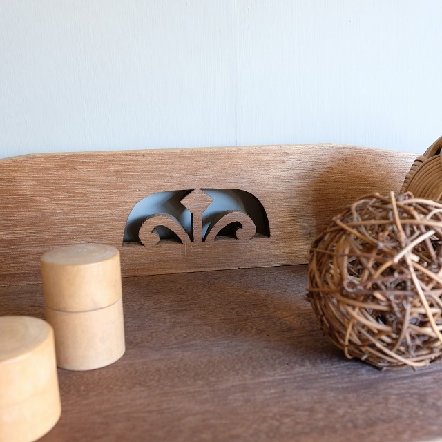 古家具らしい楔式本棚です。楔式本棚の中では、幅のないスリムなサイズが珍しいです。スリムながらも奥行きがあるので、本以外にも雑貨が飾りやすいです。木の厚みがあり、重厚な本棚です。上部には透かしがあり上品です。現代のインテリアに合う軽やかな木肌です。