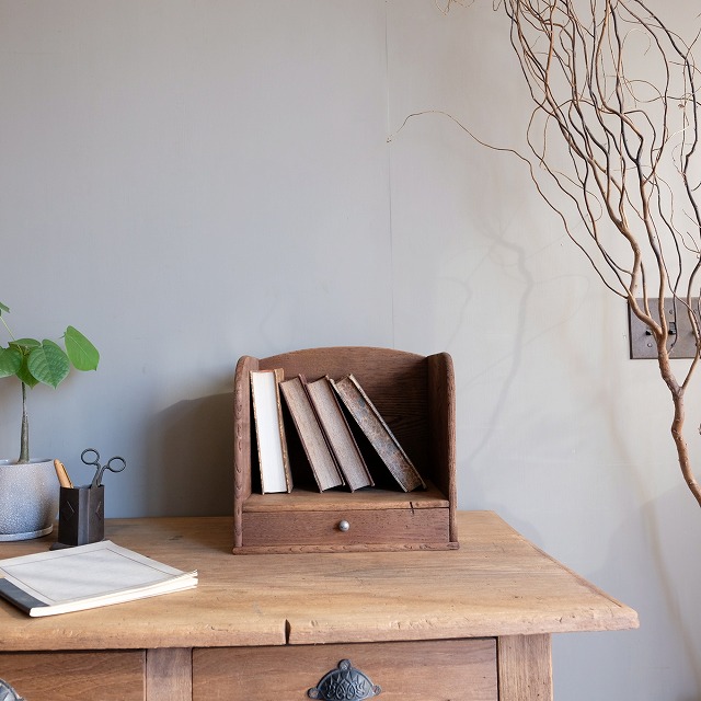 味わいのあるシンプルな無垢の本立てです。1杯の引き出し付きで、細かな収納に便利です。