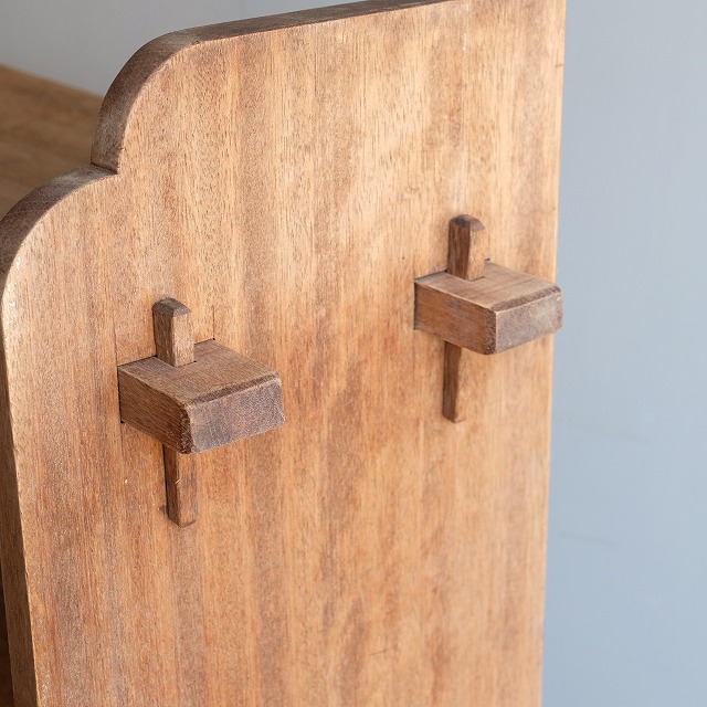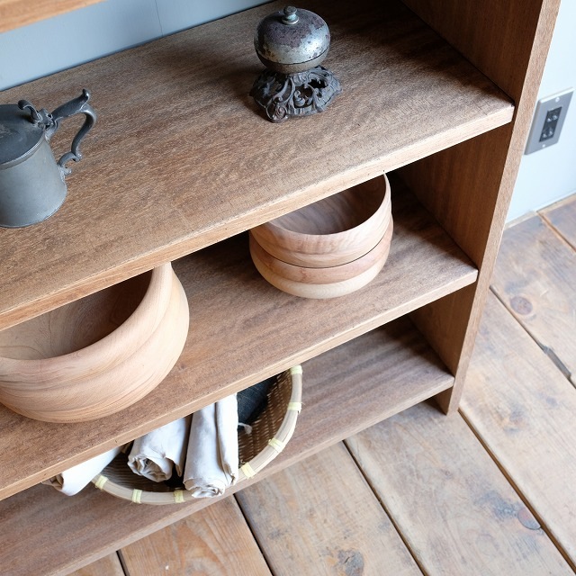 古家具らしい楔式本棚です。楔式本棚の中では奥行きがあるタイプですので、本以外にも雑貨が飾りやすいです。3枚の棚板は背面から取り外しができますので、高さのある物を収納したい時に便利です。現代のインテリアに合う軽やかな木肌です。