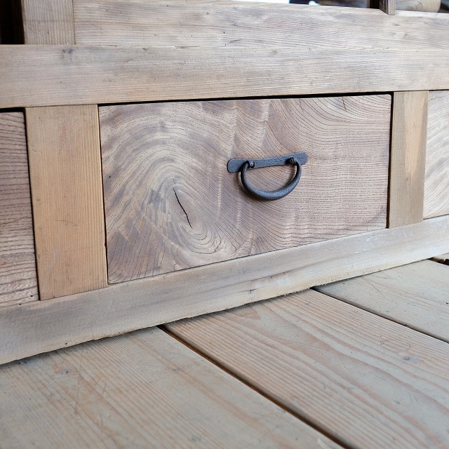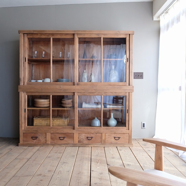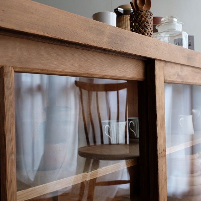 横長タイプのキャビネットです。キッチンでは食器棚やカウンター台にしたり、リビングではテレビボードやキャビネットにしたりと、使い勝手の良い家具だと思います。4杯の引き出し付きで、日用品の収納ができ便利です。また、背板がとても味わいがありますので、ショップカウンターとしてもお勧めです。