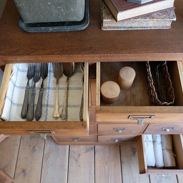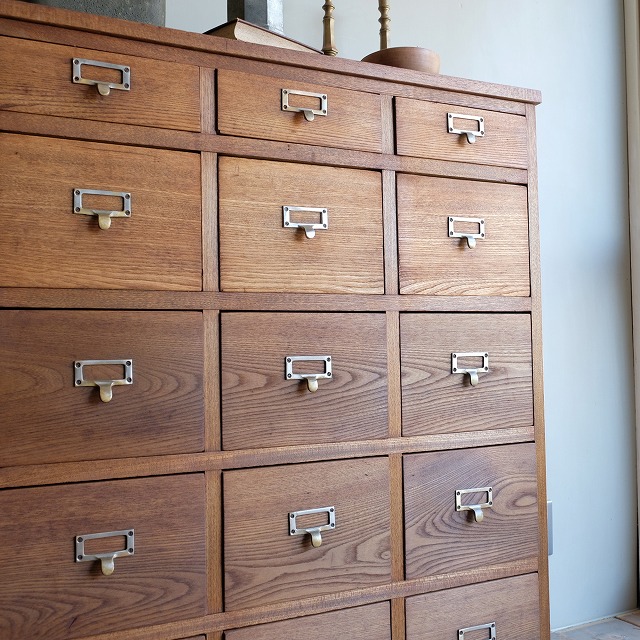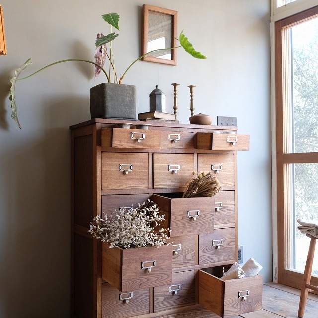 1段目が小さい引き出しですが、その他の引き出しは使いやすいサイズ感です。15杯の引き出しがあり、収納整理がしやすく、ネームプレートの取っ手でラベリングもできます。お部屋にこれ一台あると、かなり収納ができ、インテリアの主役の家具になると思います。