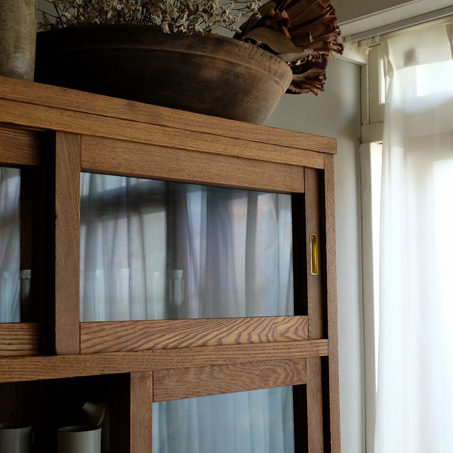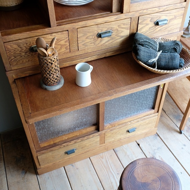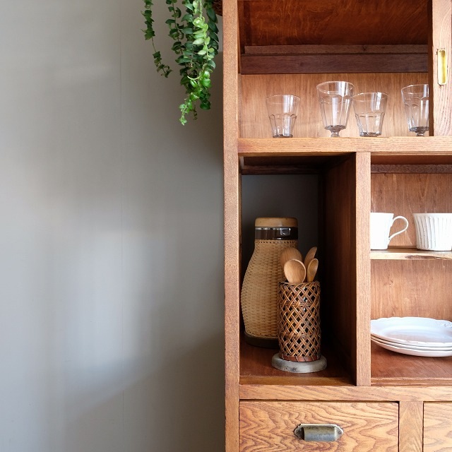 食器棚にこういったオープン棚があるのは嬉しいポイントです。すぐに取り出したいポットなどを置くのに便利です。また、グリーンを飾っても素敵ですね。