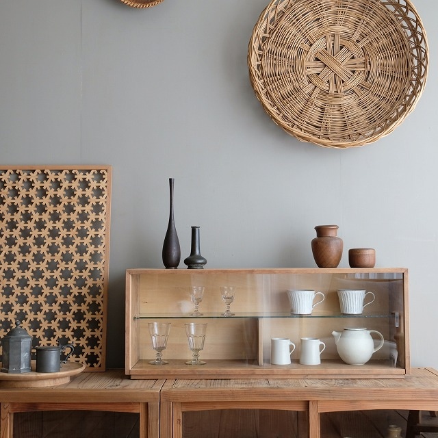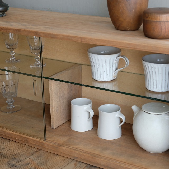 前面のガラス引き戸のショーケースです。木枠がないガラス戸ですので、中の物がとてもすっきりと見えます。棚板もガラスですので、さらにすっきりと見えます。カウンター上にお茶道具を飾ったり、お好きな雑貨のコレクションケースとしていかがでしょうか。