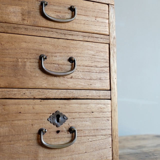 小ぶりなサイズの桐製の引き出しです。素朴な風合いの木地です。また昔ながらの和金具も素朴で素敵です。小さな引き出しは置いてあるだけでもオブジェなります。