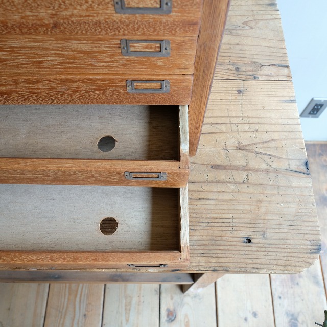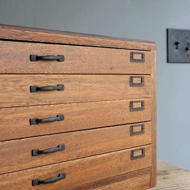 ひとつの引き出しが薄く、A3用紙が入る珍しいサイズの書類ケースです。シンプルな取っ手とネームプレートが付いて、色々なお部屋に合わせやすいと思います。