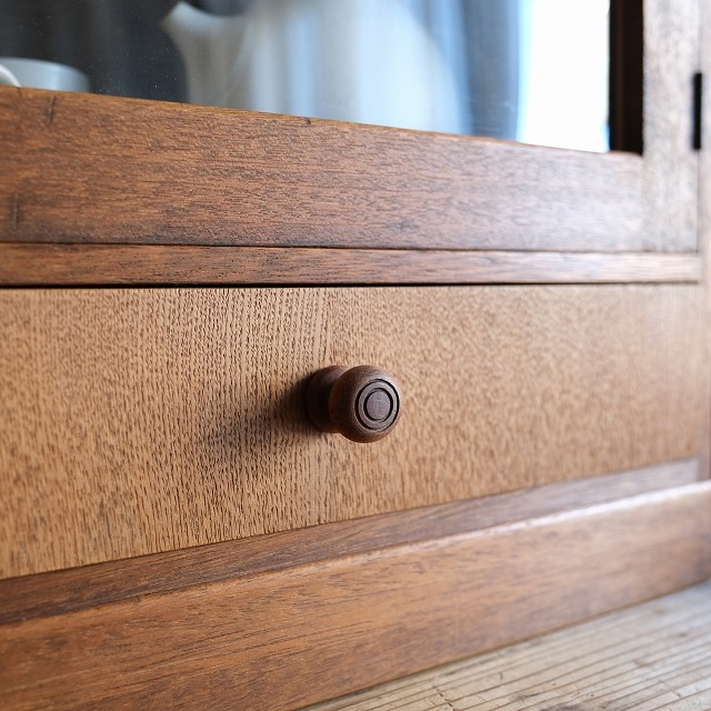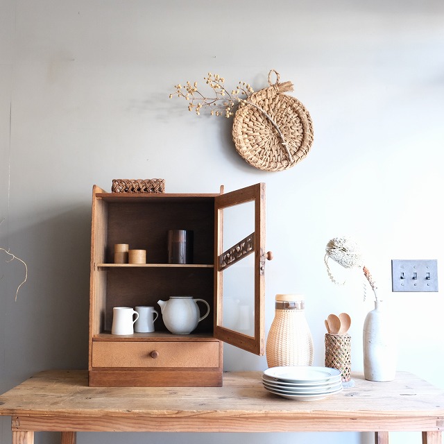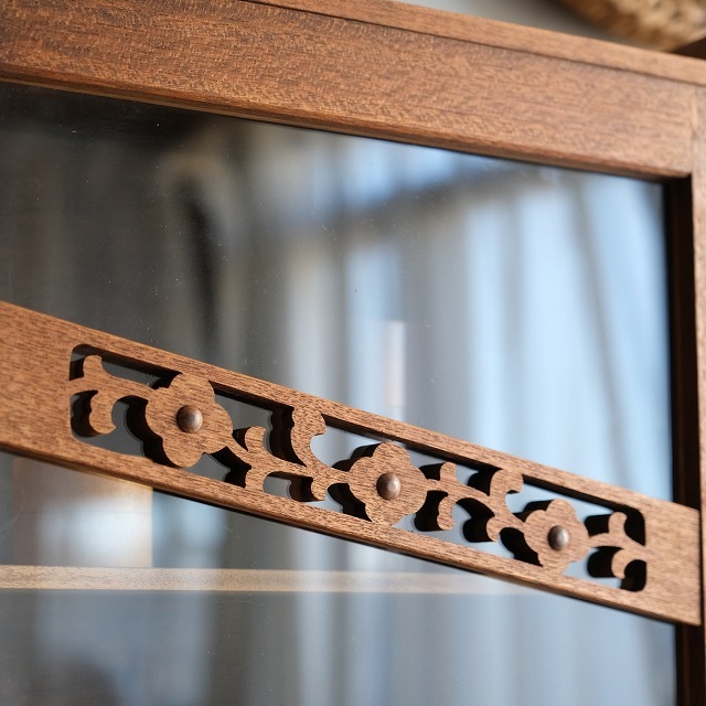 扉の斜めに入った花の透かしが印象的です。小ぶりな開き戸式キャビネットです。カップやグラスを少し飾りたい時や、アクセサリーなどの小物を飾りたい時にちょうどいいサイズです。カウンター上やテーブル上にも、あまり邪魔にならない大きさです。