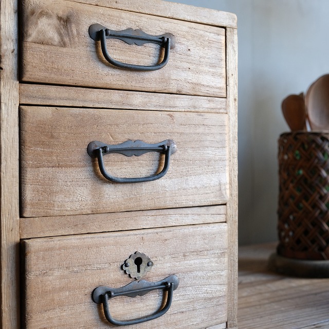 小ぶりなサイズの桐製の引き出しです。素朴な風合いの木地です。また昔ながらの和金具も素朴で素敵です。小さな引き出しは置いてあるだけでもオブジェなります。
