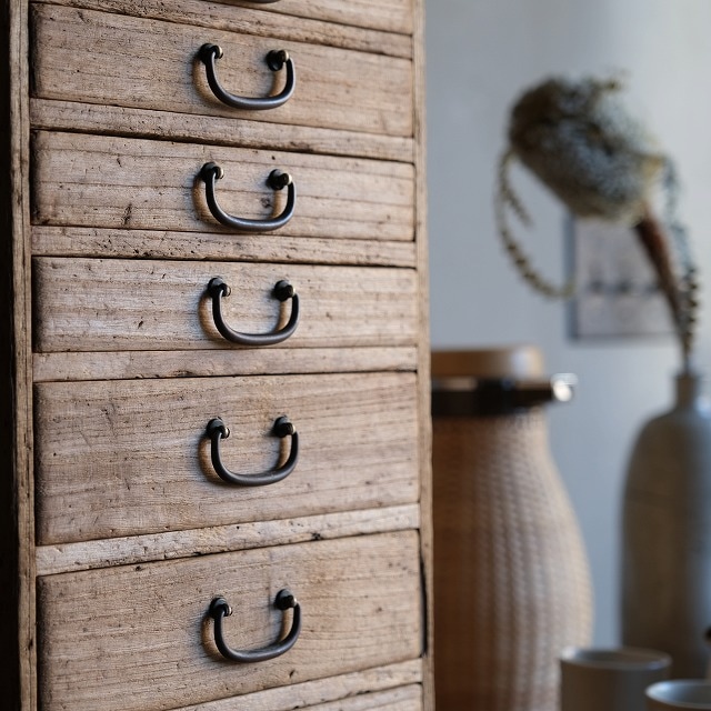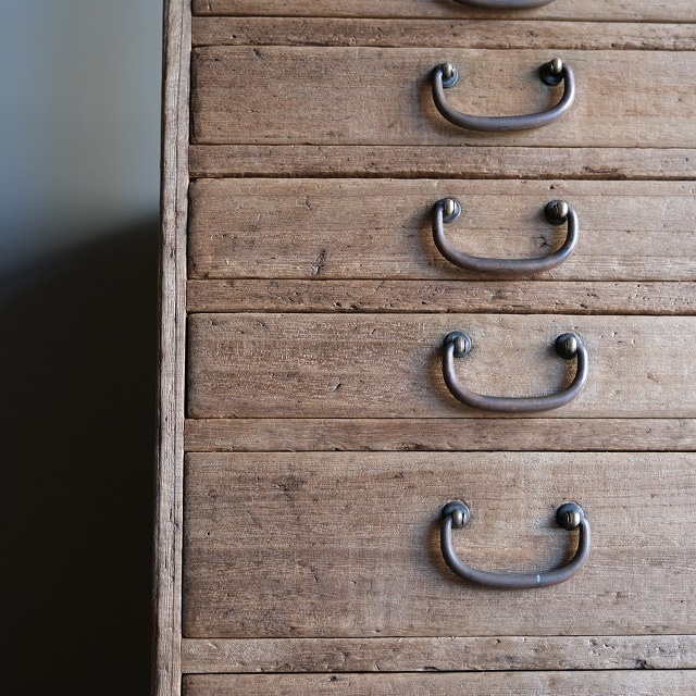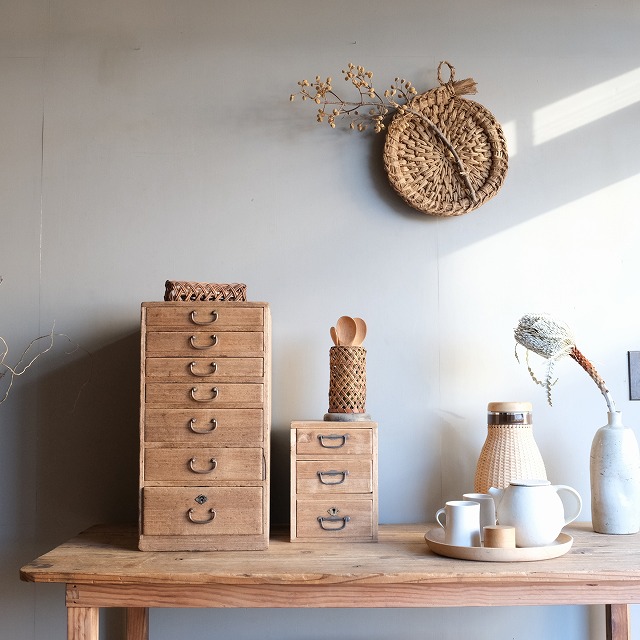 桐製の引き出しです。素朴な風合いが特長の木地です。また昔ながらの和金具も素朴で素敵です。引き出しは下段にいくほど大きくなっていますので、いろいろ収納できます。