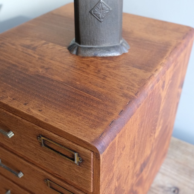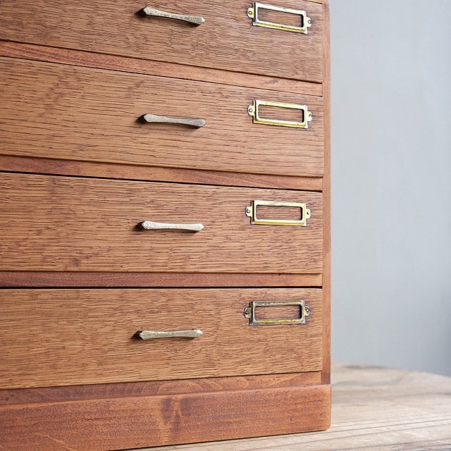 シンプルな取っ手とネームプレートの組み合わせで、とても人気のある引き出しです。ナチュラルアンティークのお部屋にとても似合います。