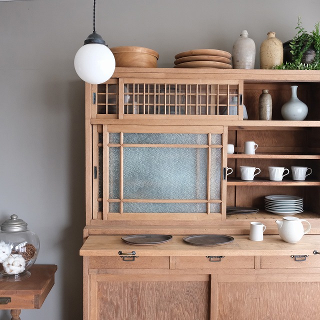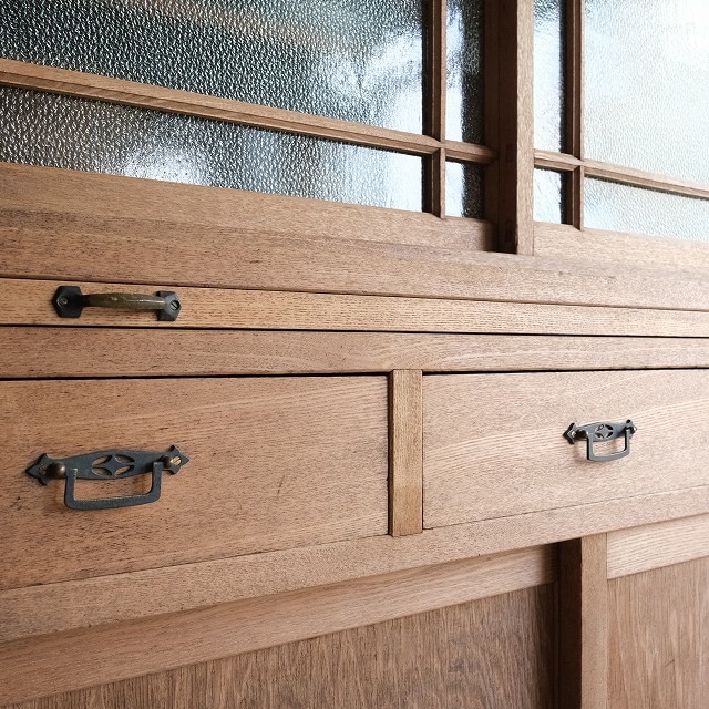 上質な食器棚には、取っ手にも拘りのある金具が付いています。また、こちらは無塗装仕上げです。木そのままの優しい風合いです。