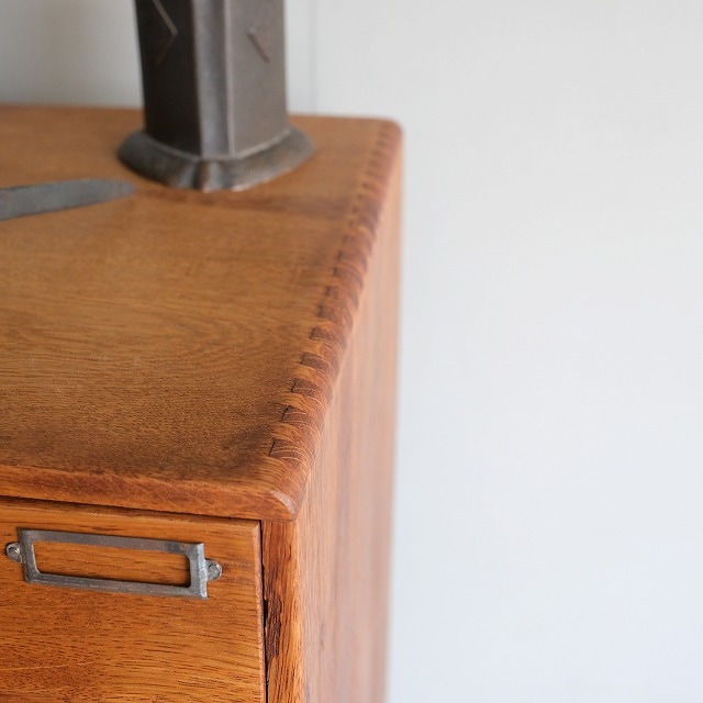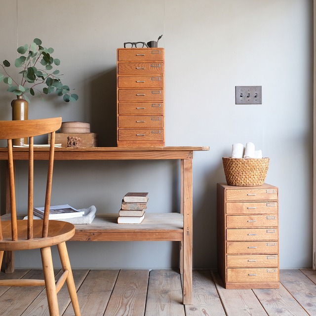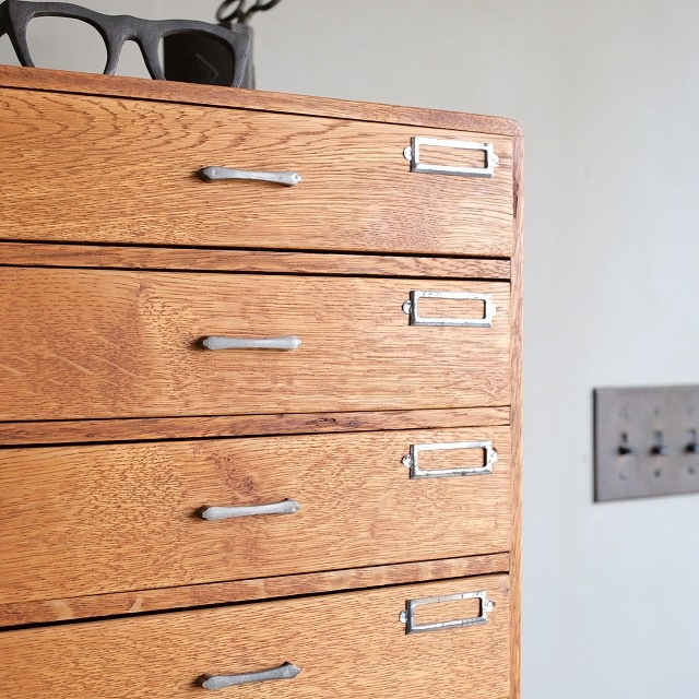床に置いても、卓上にしても使えるサイズ感です。シンプルな取っ手とネームプレートの組み合わせで、とても人気のある引き出しです。ナチュラルアンティークのお部屋に似合う引き出しです。