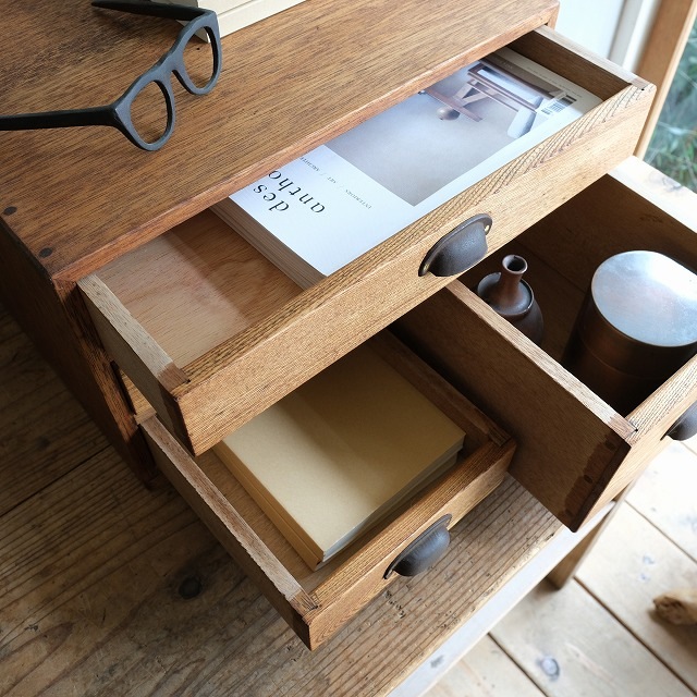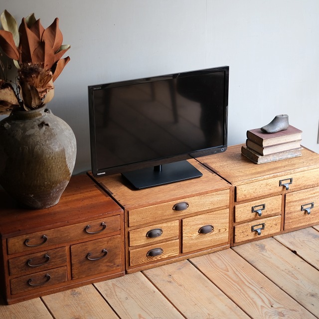類似タイプの取っ手が異なる引き出しが同時入荷しました。複数並べてローボードのような使い方もアリですね。