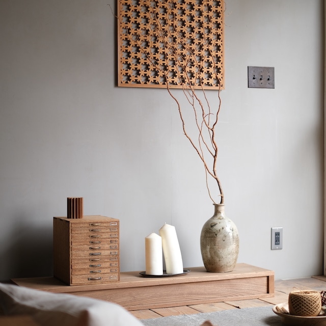小ぶりな引き出しながら引き出しの数が多く、そして取っ手とネームプレートが所狭しと配列されています。とても印象深いですね。ひとつの引き出しが薄いので、紙類の収納に適しています。
