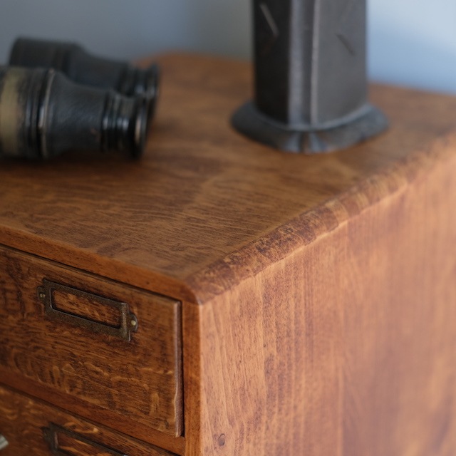 シンプルな取っ手とネームプレートの組み合わせの引き出し。下の引き出しが少し深くなっています。こちらは古い塗装を剥がした後、当店オリジナルカラーに仕上げました。この色味は明るすぎず暗すぎない色。そして「茶色」の中でも、こげ茶になりすぎず赤茶になりすぎず黄茶にもなりすぎないように試行錯誤の末、辿り着いた色味となっています。またあまり艶を出しすぎないマットな質感に拘りました。ナチュラルアンティークのお部屋にとても似合うと思います。