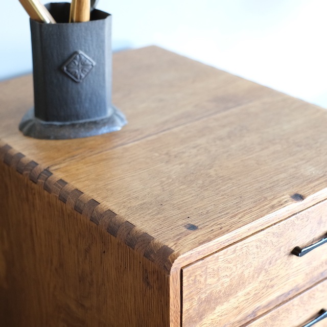 シンプルな取っ手とネームプレートの組み合わせの引き出し。こちらは古い塗装を剥がした後、当店オリジナルカラーに仕上げました。この色味は明るすぎず暗すぎない色。そして「茶色」の中でも、こげ茶になりすぎず赤茶になりすぎず黄茶にもなりすぎないように試行錯誤の末、辿り着いた色味となっています。またあまり艶を出しすぎないマットな質感に拘りました。ナチュラルアンティークのお部屋にとても似合うと思います。