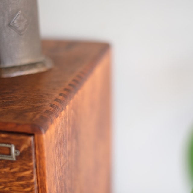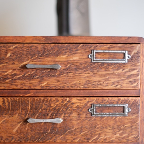 シンプルな取っ手とネームプレートの組み合わせの引き出し。下の引き出しが少し深くなっています。こちらは古い塗装を剥がした後、当店オリジナルカラーに仕上げました。この色味は明るすぎず暗すぎない色。そして「茶色」の中でも、こげ茶になりすぎず赤茶になりすぎず黄茶にもなりすぎないように試行錯誤の末、辿り着いた色味となっています。またあまり艶を出しすぎないマットな質感に拘りました。ナチュラルアンティークのお部屋にとても似合うと思います。