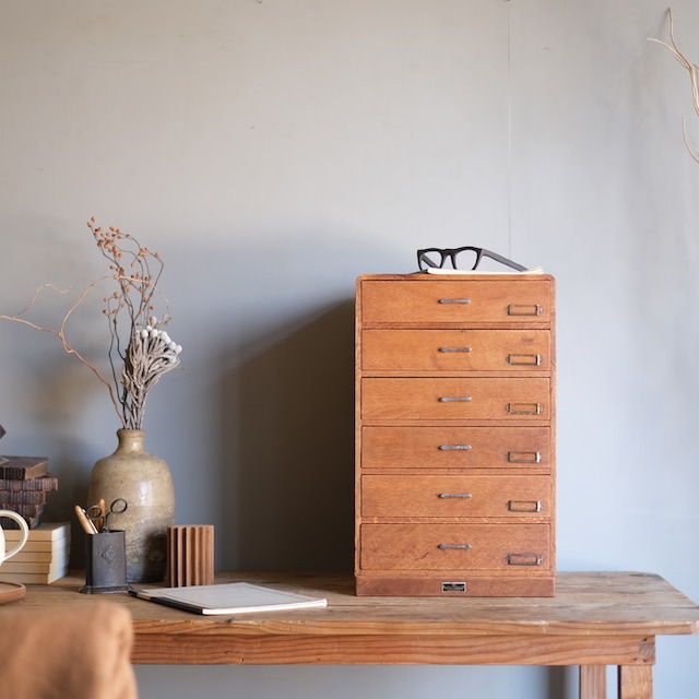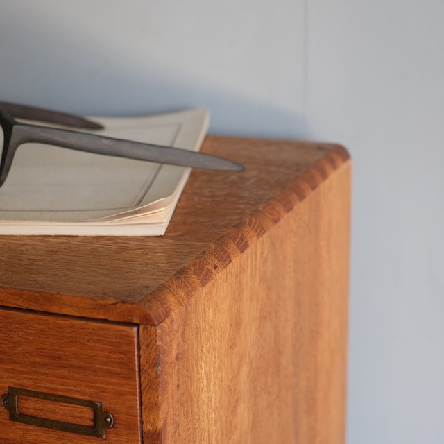 シンプルな取っ手とネームプレートの組み合わせの引き出し。下の引き出しが少し深くなっています。こちらは古い塗装を剥がした後、当店オリジナルカラーに仕上げました。この色味は明るすぎず暗すぎない色。そして「茶色」の中でも、こげ茶になりすぎず赤茶になりすぎず黄茶にもなりすぎないように試行錯誤の末、辿り着いた色味となっています。またあまり艶を出しすぎないマットな質感に拘りました。ナチュラルアンティークのお部屋にとても似合うと思います。