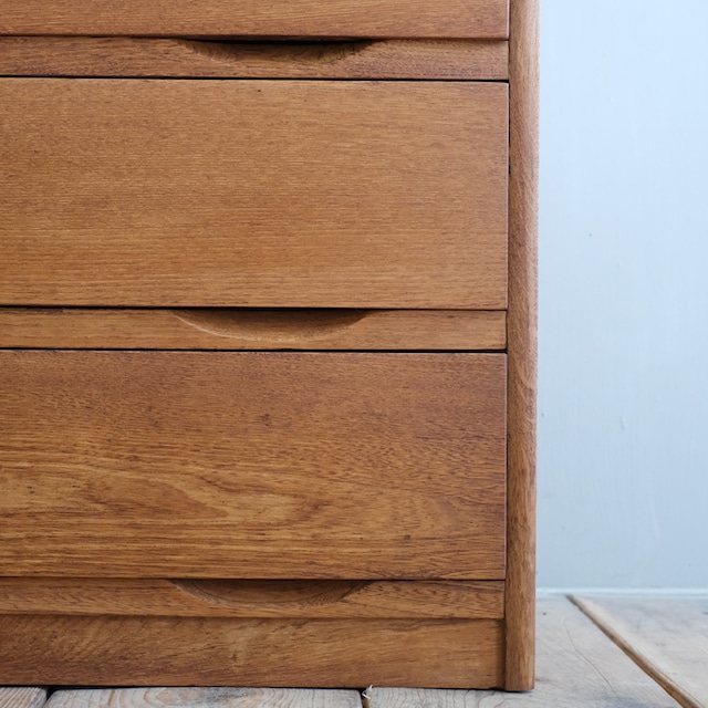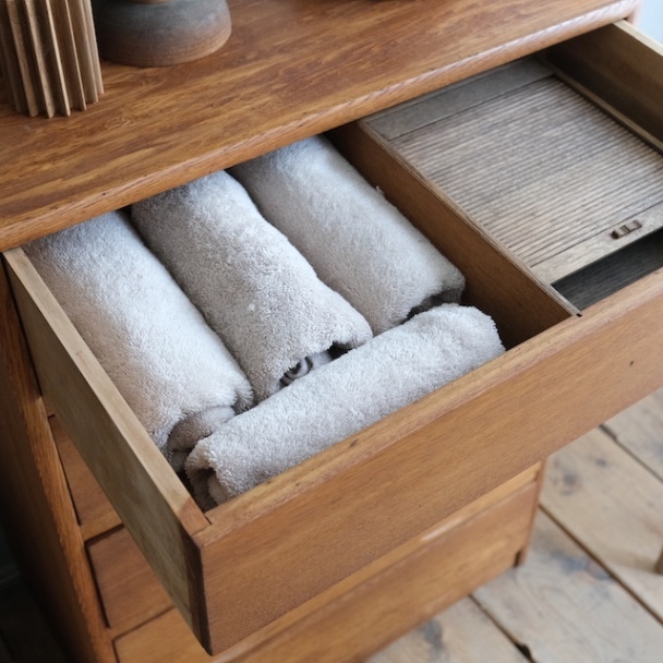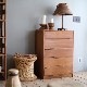 一般的なサイズのチェストは大きくてお部屋に圧迫感を与えてしまうこともあります。こちらのチェストは小ぶりでコンパクトなお部屋や子供部屋に置いても重くなりにくいと思います。そして収納は”たっぷりと欲しい”も叶えてくれる、そんな絶妙なチェストです。取っ手がなく表面がすっきりとしている所も、お部屋への圧迫感を軽減してくれるポイントですね。