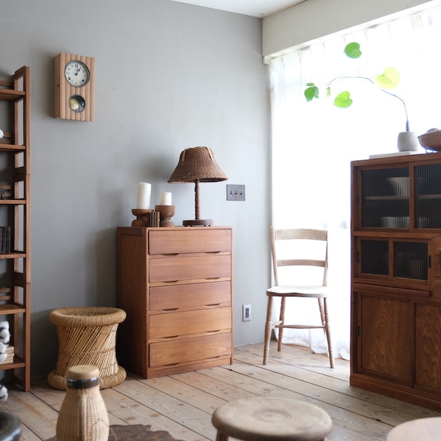 こちらは古い塗装を剥がした後、当店オリジナルカラーに仕上げました。この色味は明るすぎず暗すぎない色。そして「茶色」の中でも、こげ茶になりすぎず赤茶になりすぎず黄茶にもなりすぎないように試行錯誤の末、辿り着いた色味となっています。またあまり艶を出しすぎないマットな質感に拘りました。ナチュラルアンティークのお部屋にとても似合うと思います。