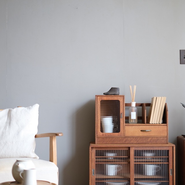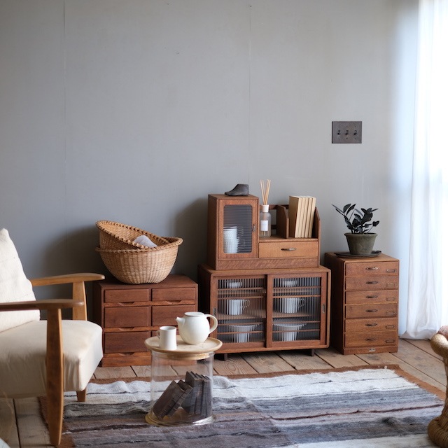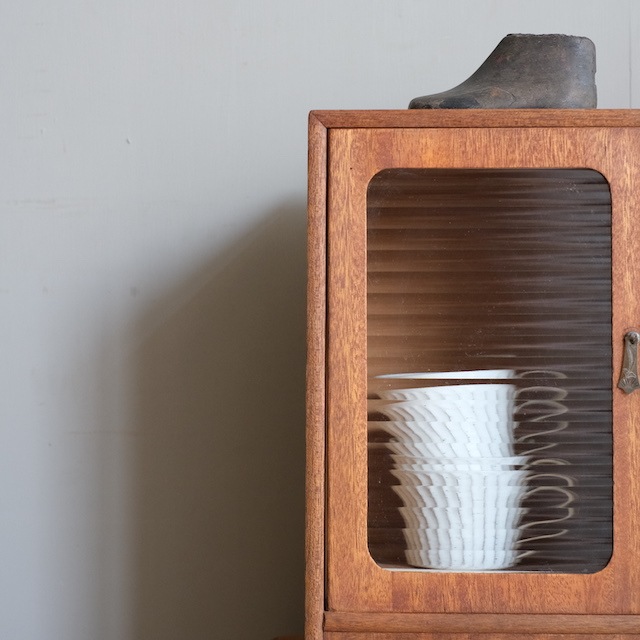 小さな家具の中に「キャビネット」「本立て」「引き出し」と収納要素が詰まっています。デスクの上や棚の上にあると、とても使いやすいですね。開き扉にはモールガラスが使われています。