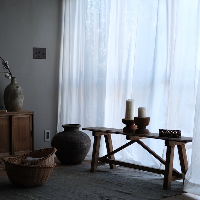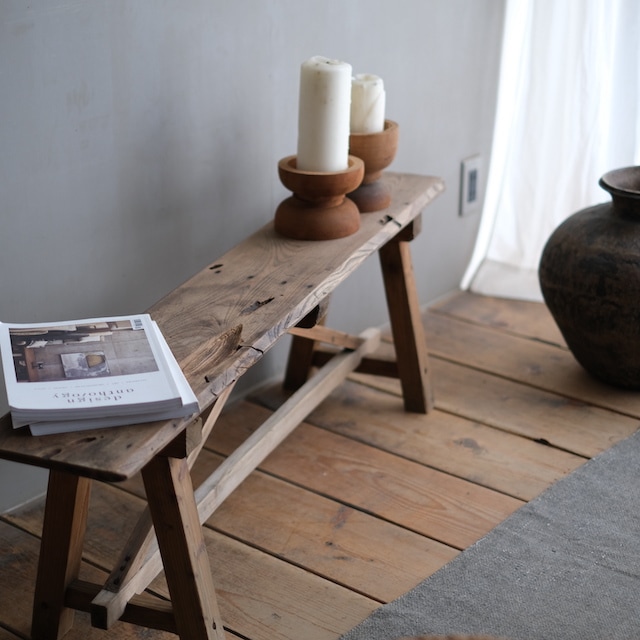 天板の奥行きがないすっきりとしたベンチ。お部屋への圧迫感が少ないコンパクトなサイズです。素朴な風合いのベンチですが、特に天板の杢目や節など、経年変化した表情が魅力です。
