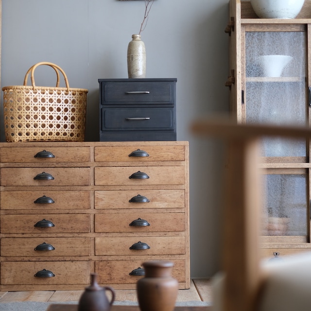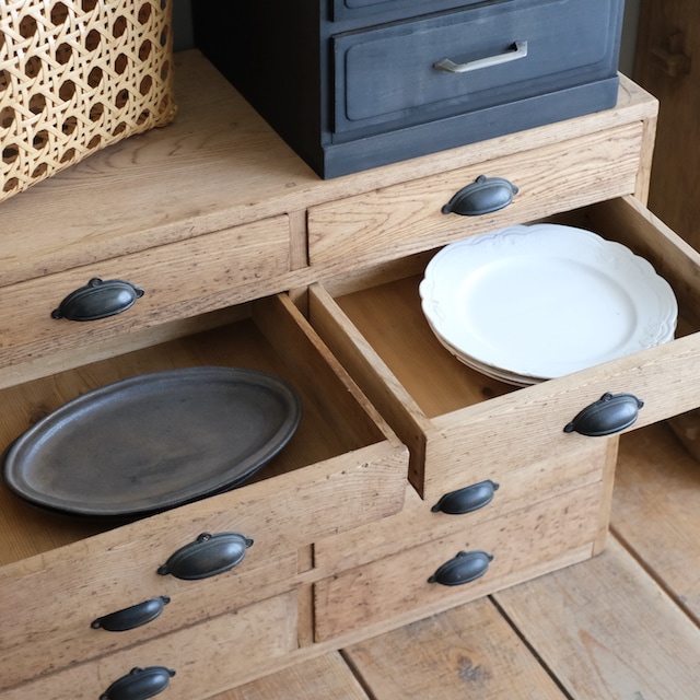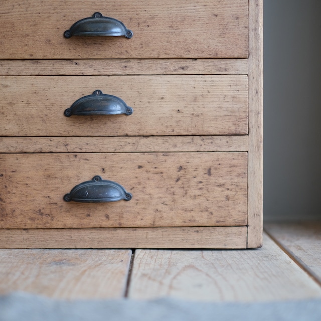 渋みを増した古い取っ手が魅力。引き出しに置いて、取っ手は印象を左右する大切な役割がありますね