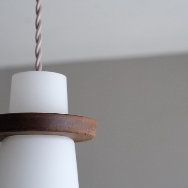 シンプルな乳白ガラスのペンダントライト。ウッドリングが付いて、まるでバングルのようなさりげないアクセントが素敵です。柔らかな光を照らしてくれる乳白ガラスは、お部屋に温かみをもたらしてくれます。口金E26 電球は付属しません。※ソケット、配線、引っ掛けシーリングはPSE対応の新品に交換しています。