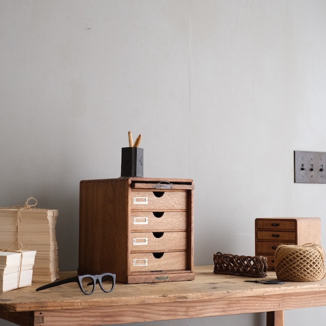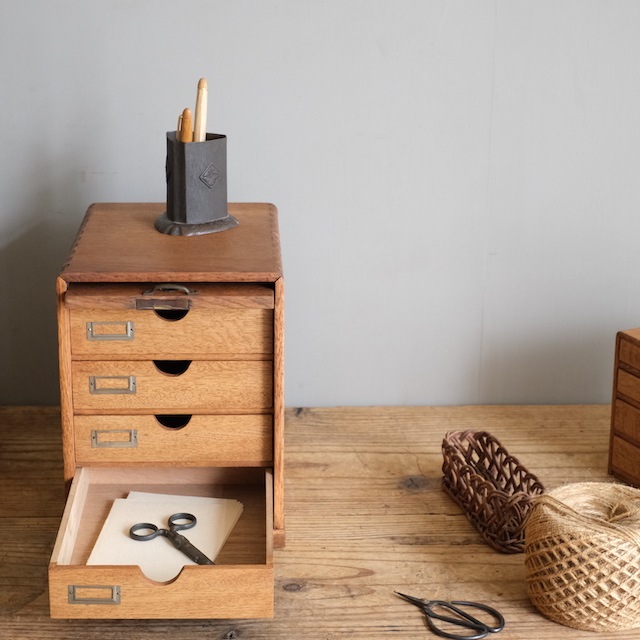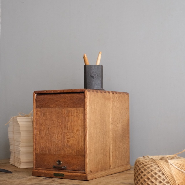 扉を持ち上げ上部に収納するフラップ扉が付いた、小ぶりな引き出しです。扉が閉まっている時はすっきりとした箱のようです。開けた状態のままでも可愛らしく、表情の違いが愉しめます。ワンランク上の引き出しをお愉しみください。こちらは古い塗装を剥がした後、当店オリジナルカラーに仕上げました。この色味は明るすぎず暗すぎない色。そして「茶色」の中でも、こげ茶になりすぎず赤茶になりすぎず黄茶にもなりすぎないように試行錯誤の末、辿り着いた色味となっています。またあまり艶を出しすぎないマットな質感に拘りました。ナチュラルアンティークのお部屋にとても似合うと思います。