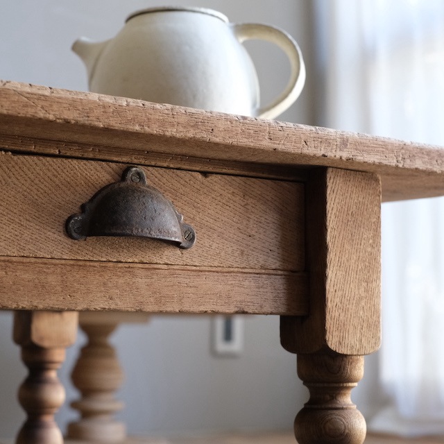 使い勝手の良いサイズ感のテーブル。ソファ用のセンターテーブルにしたり展示台にしたり、色々な場面でお使いいただけます。ろくろ脚が上品なテーブルです。また2杯の引き出しが付いて、細かな物を収納できるのが嬉しいです。