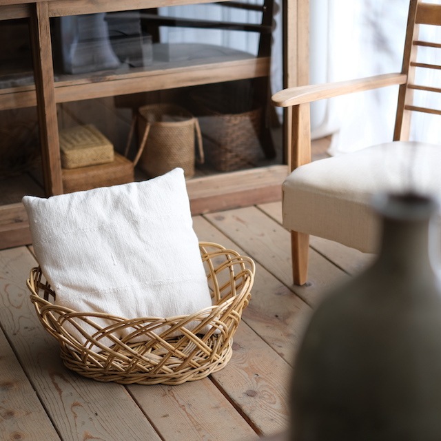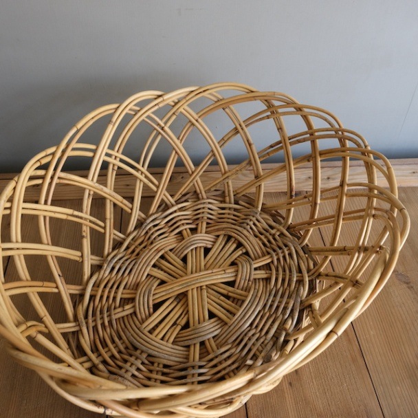 太い籐でざっくりと編んだ丈夫な籠。楕円の形だから奥行きがない場所でも使いやすい形。編み目が大きいので縁が持ち手となるので、日頃のお洗濯籠にちょうどいいです。