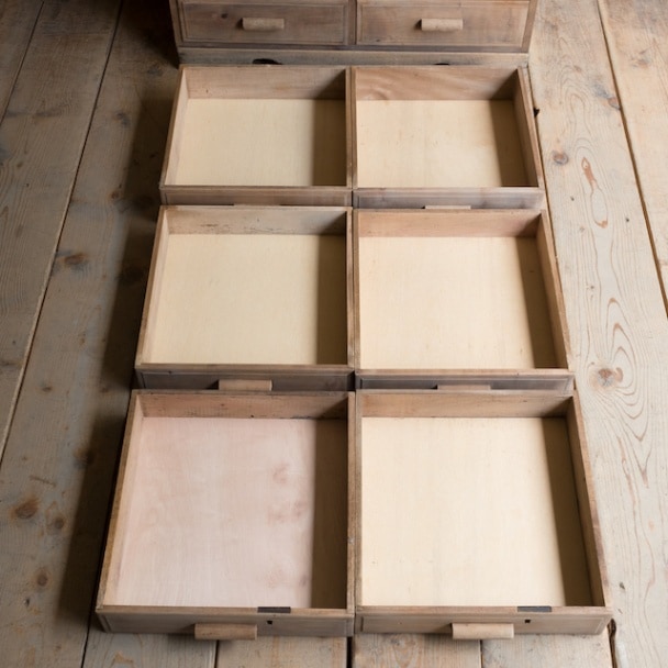 一般的に金属製の取っ手が付いていることが多い引き出しですが、こちらは木の取っ手が付いたチェストです。よりナチュラルな雰囲気が出ますね。引き出しは下に行くほど大きくなっている構成で、小物から布類など仕分けがしやすいですね。