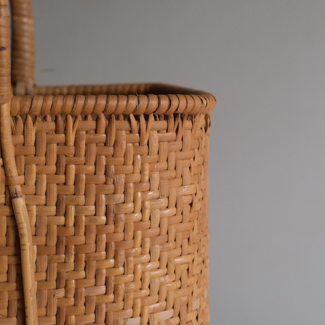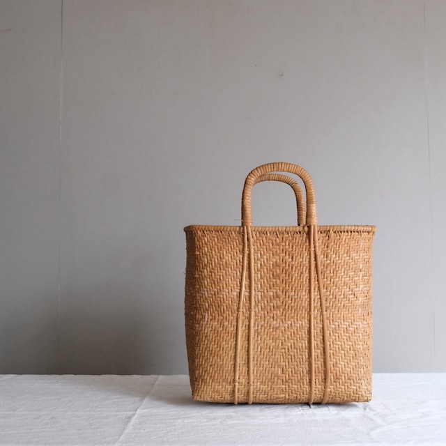 網代に編まれた皮籐製の手提げ籠です。皮籐の表面はエナメル質のようなツヤがあり、水にも強く丈夫です。シンプルで日常に使いやすい形です。普段使いから和装にも使えるバッグです。