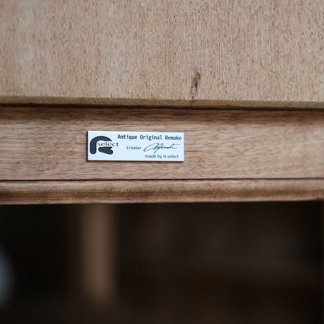 背の高い脚が付いたキャビネット。こちらの商品は「R-select リデザインプロダクト」です。上部のキャビネットと下部の脚は、元々は別々の家具でした。それを掛け合わせ、キャビネットを制作しました。