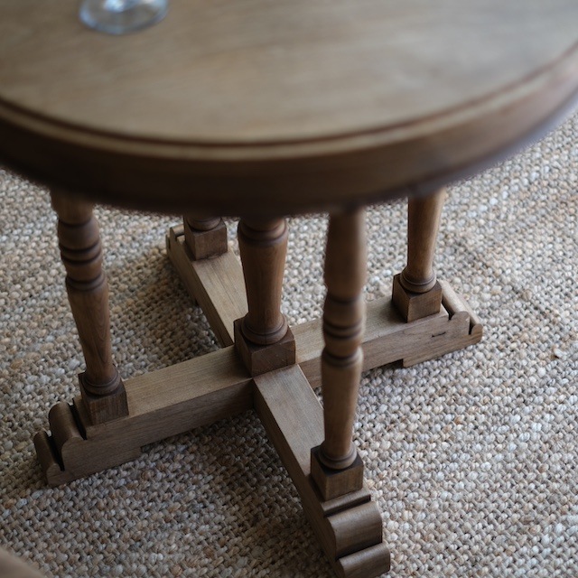 5本のろくろ脚が印象的なラウンドテーブル、とても贅沢で存在感があります。比較的コンパクトサイズですので、二人掛け用のテーブルにしたり、花台のような展示台にしたり、お部屋に取り入れやすいラウンドテーブルです。