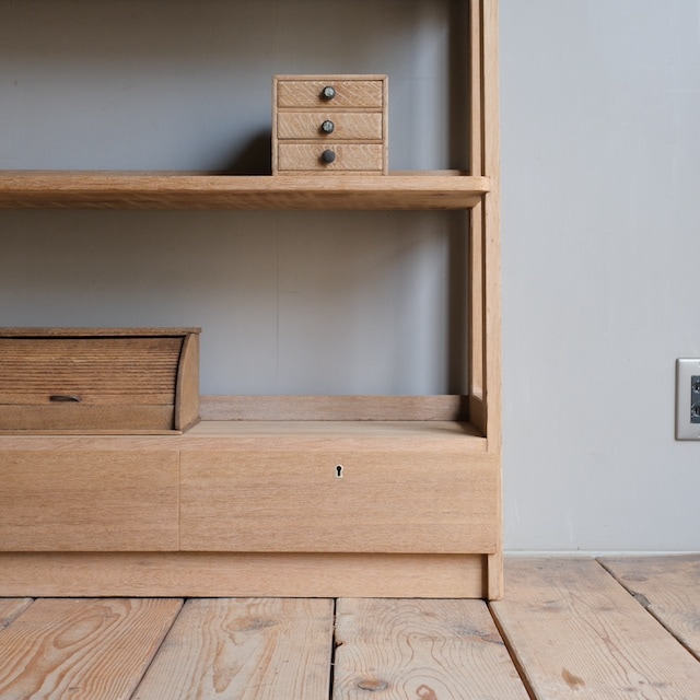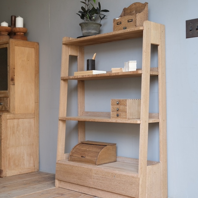 側面から見たら斜めの形をしたシェルフ、立体的に飾れるので素敵な空間になります。無駄のないシンプルな形がいいですね。2杯の引き出しが付いています。