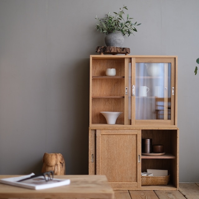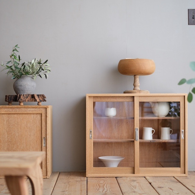テーブルや棚の上に置く卓上キャビネットにしたり、床に置いてローキャビネットのように使ったりる小ぶりなキャビネット。 ちょっとしたお茶の時間にカップや急須を入れておくのもいいと思います。一人暮らしの食器棚もいいと思います。