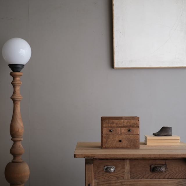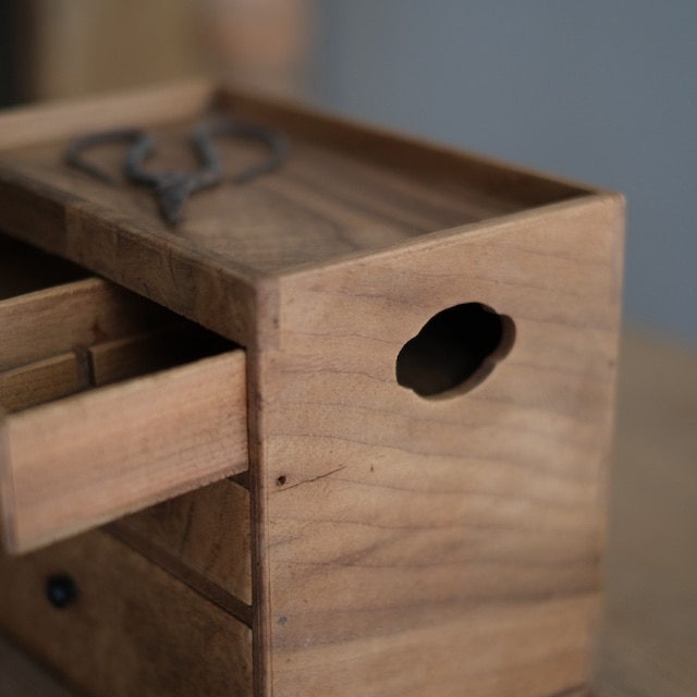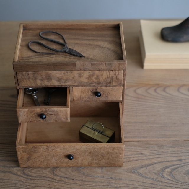 瘤杢の美しい景色を愉しめる、ちいさな引き出し箱。大きさが異なる引き出しが4杯あり、入れる物に合わせて仕舞えるところがいいです。一番上の引き出しは取っ手がありません。側面の透かしから指を入れて両手で引き出します。粋な感じがあって素敵です。