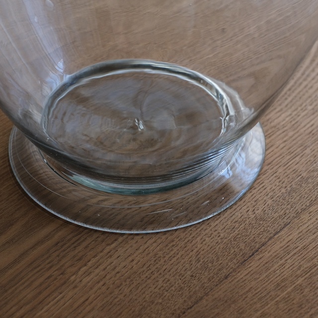 一般的な丸い形の地球瓶ではなく縦長タイプガラス瓶です。足付きで安定感があるガラス瓶です。佇まいが上品で何を入れてもオシャレに保存できますね。古いガラスが魅力です。