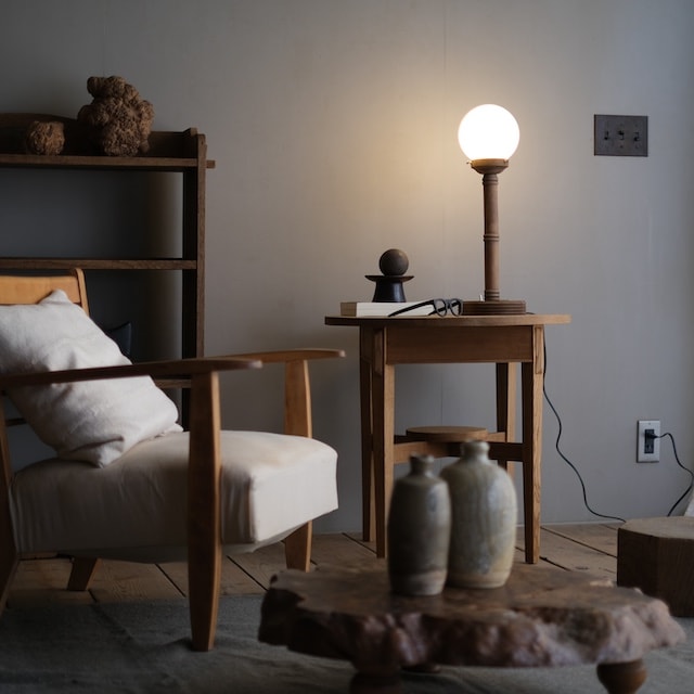優しい光を照らしてくれる乳白ガラスと木の温もりを感じるスタンドの組み合わせのテーブルランプ。こちらの商品は「R-select リデザインプロダクト」です。元々は違った形のシェードが付いていましたが、丸い乳白ガラスのシェードにリデザインしました。月のように満遍なく、優しい光でお部屋を照らします。