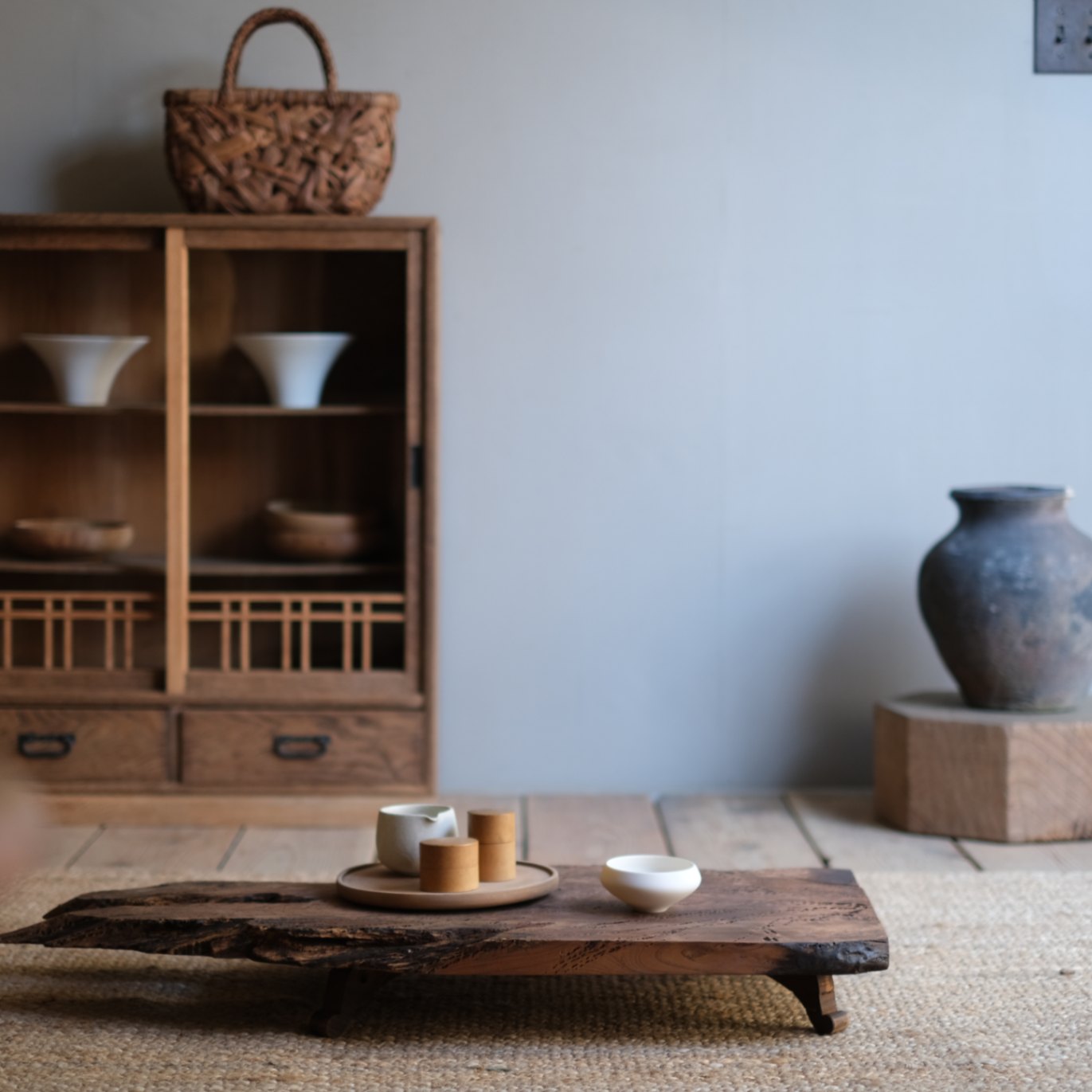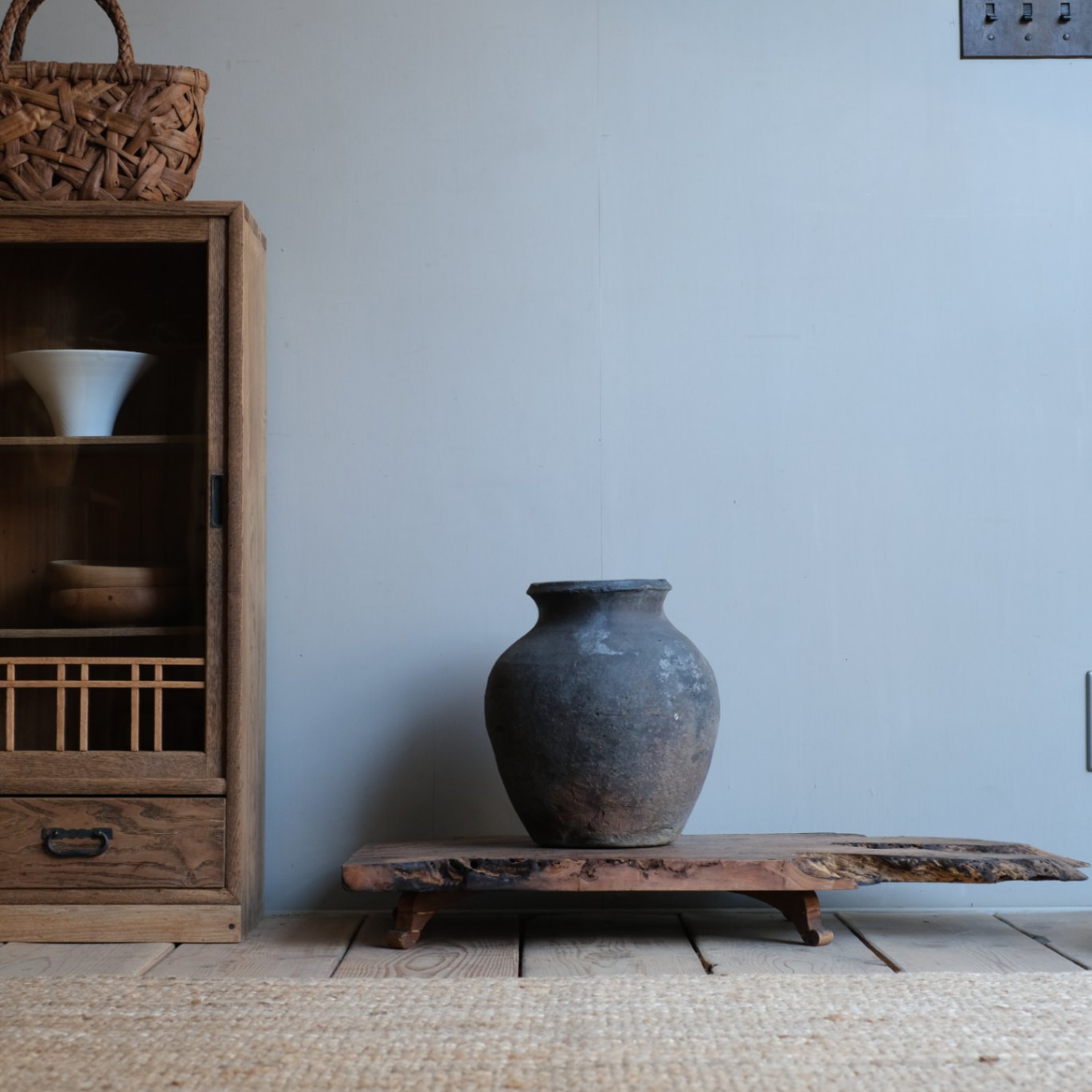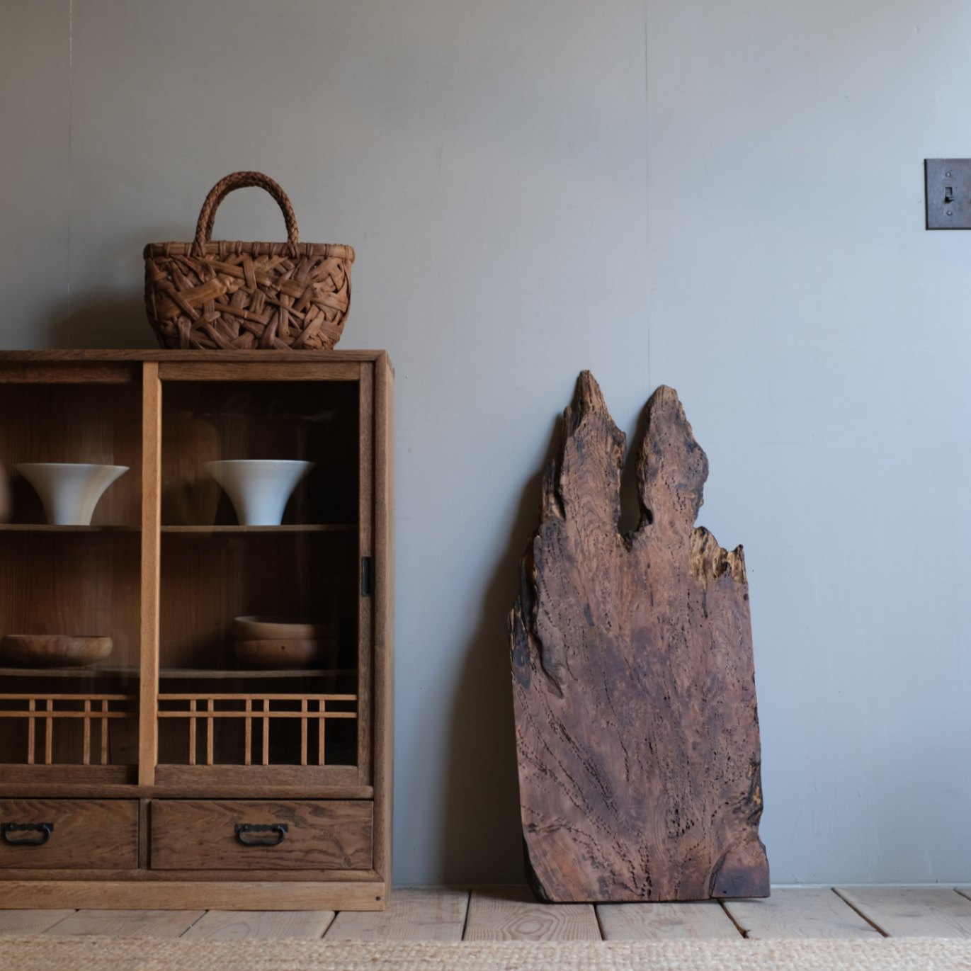 自然のままの造形が美しい木を天板にした展示台。縁が木のままで無骨な感じが素敵です。また天板には無数の小さな穴が空いています。こちらも自然なアートですね。インテリアのスパイス的に取り入れてみれば、ワンランク上の印象を添えてくれるでしょう。