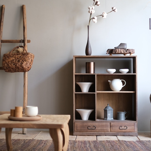 昔ながらの倹飩(けんどん)扉、本体の上下に溝がありますので、上溝を合わせてから下溝に合わせる方式の扉です。普段は扉を付けて収納しますが、何か使いたい時に扉を開放すれば、オープン棚として魅せることもできます。 お茶道具を飾ったり、侘び寂びの趣のある雰囲気が素敵です。