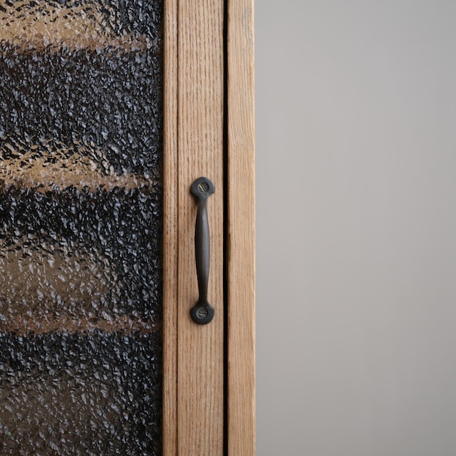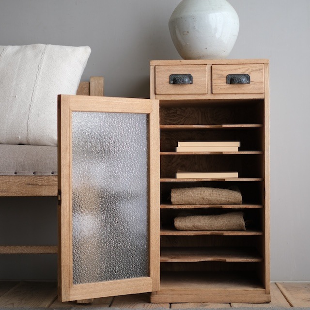 ダイヤガラス扉の収納棚。ぼんやりと中の物が見える感じが素敵です。上部に2杯の引き出しが付いていますので、小物を取り出す時にしゃがまなくても、さっと取り出しやすい所がいいですね。コンパクトなお部屋、もう一台収納棚を追加したい時などに、こんなスリムな収納棚がちょうどいいと思います。