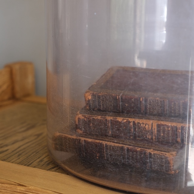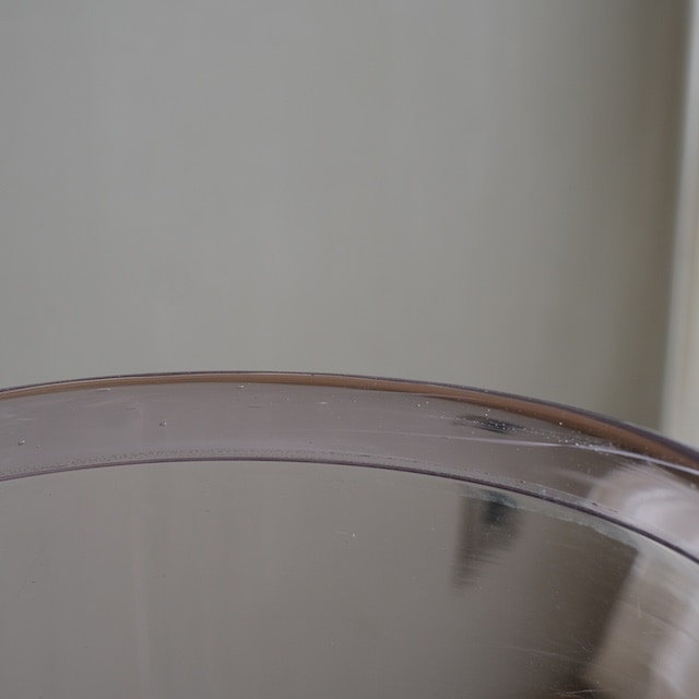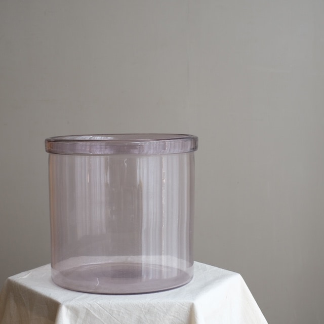 大きな円筒型のガラス瓶。うっすらと紫がかった色をしています。水槽としてや花瓶としていかがでしょうか。