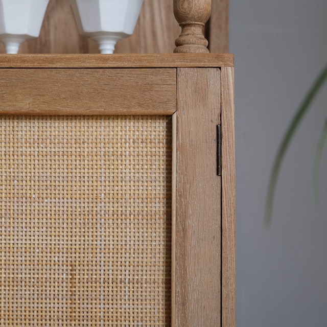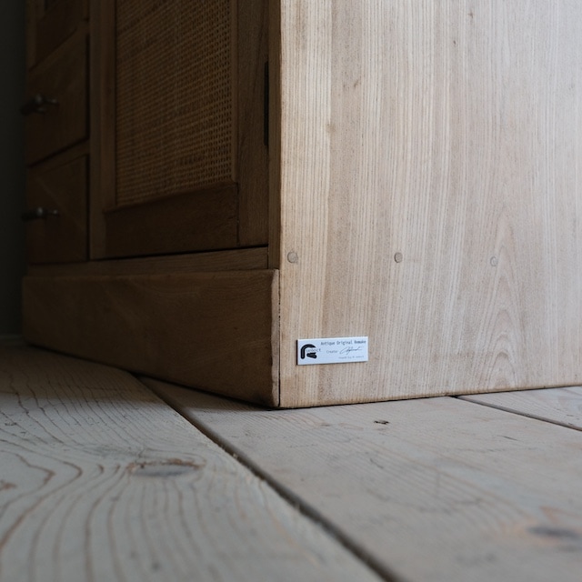 左右の構成が違うアシンメトリーキャビネット。こちらは「R-selectリデザインプロダクト」です。籐の扉を取り入れてみました。アシンメトリーというユーモアのある家具に、籐を取り入れてより遊び心を感じるキャビネットになりました。また籐の持つ自然な雰囲気は、ナチュラルインテリアがお好きな方にお勧めです。ガラス扉、ラタン扉、オープンシェルフ、引き出しと機能性に富んでいます。食器棚のような使い方、本箱のような使い方など、使う人の好みに合わせて愉しめるキャビネットです。