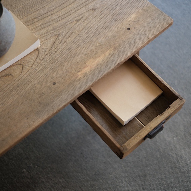 使い勝手の良いサイズ感のテーブル。ソファ用のセンターテーブルにしたり展示台にしたり、色々な場面でお使いいただけます。ろくろ脚が上品なテーブルです。また2杯の引き出しが付いて、細かな物を収納できるのが嬉しいです。